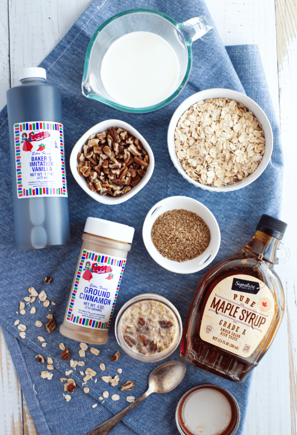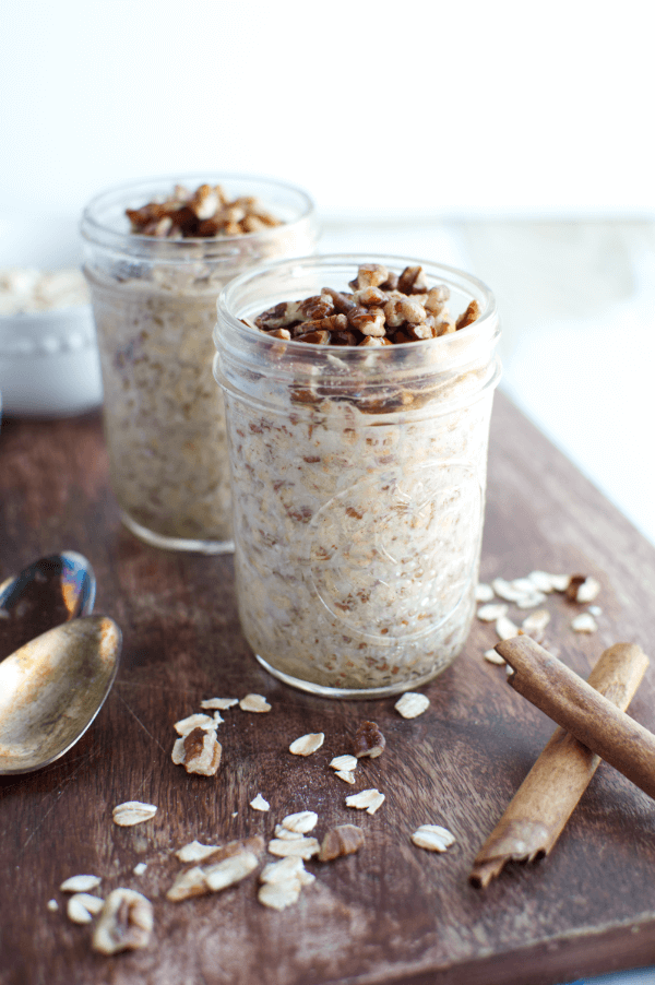 Great for meal prep, these cool, creamy, delicious overnight oats are great to make ahead and have in the fridge for a quick hearty, healthy breakfast. Spiced with cinnamon, sweetened with maple syrup and studded with toasted pecans, these simple oats are packed with flavor. The recipe below is makes one serving so it’s easy to scale up as needed!
