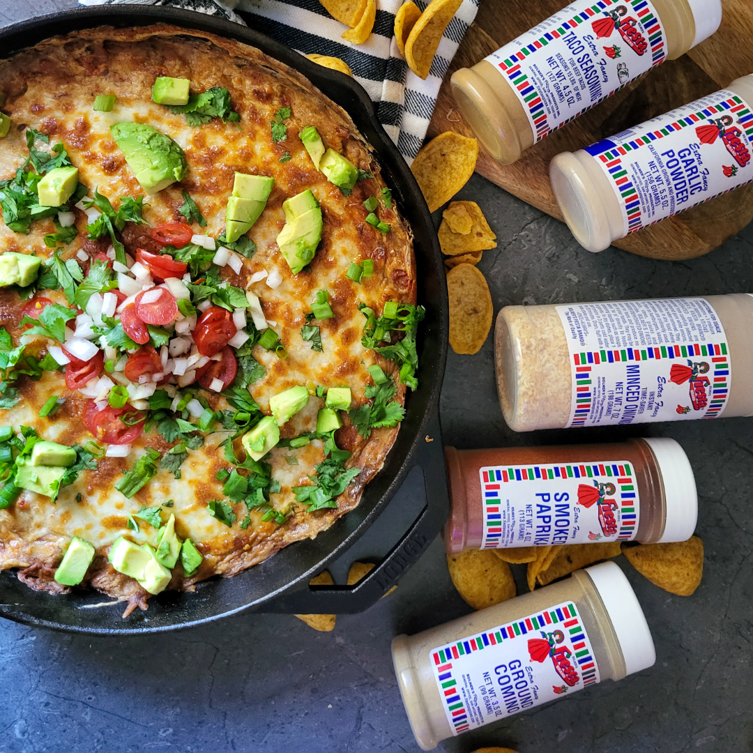 - In a large mixing bowl combine RO-TEL, pinto beans, refried beans, pickled jalapenos, and all spices except for the Taco Seasoning. Stir until everything is well incorporated. Add the mixed contents to a cast iron skillet or oven safe baking dish.
