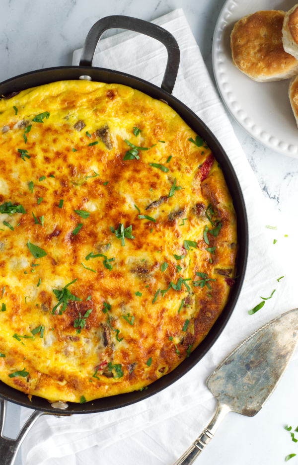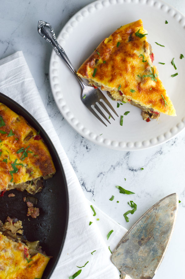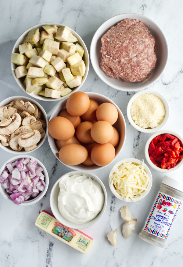 Heat the butter and oil in a 12-inch non-stick skillet over medium high heat. Add the onion, mushrooms, eggplant and 1 tsp. salt and cook for 10-12 minutes, until the vegetables are tender and beginning to brown and caramelize. Add the garlic and Italian seasoning and cook for another minute. Stir in the roasted red pepper and the cooked sausage. Sprinkle the mozzarella cheese evenly over the top of the sausage mixture.
