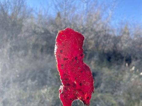 4) Cook jerky for 4 – 5 hours, testing for texture around the 3-hour mark. The jerky should bend but not snap and have a dry vs. rubbery feel. (Pro Tip – hold the jerky up to light; if you can see light through the jerky, it is done)