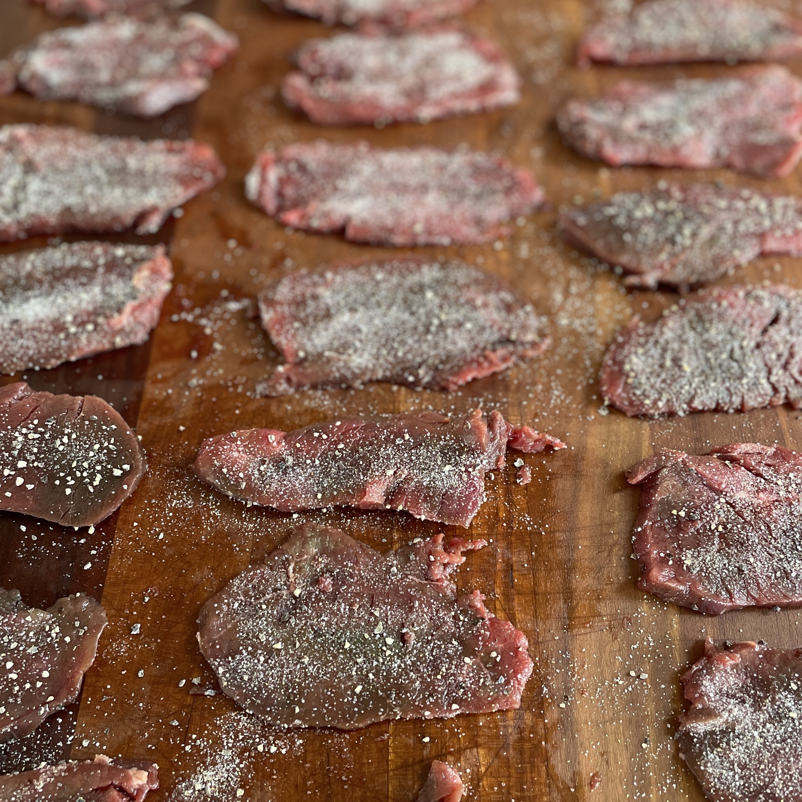 1) Using a sharp knife, slice the roast crosswise into 1/4” strips (Pro Tip – put your meat in the freezer for a couple of hours to make thin slices easier to cut).