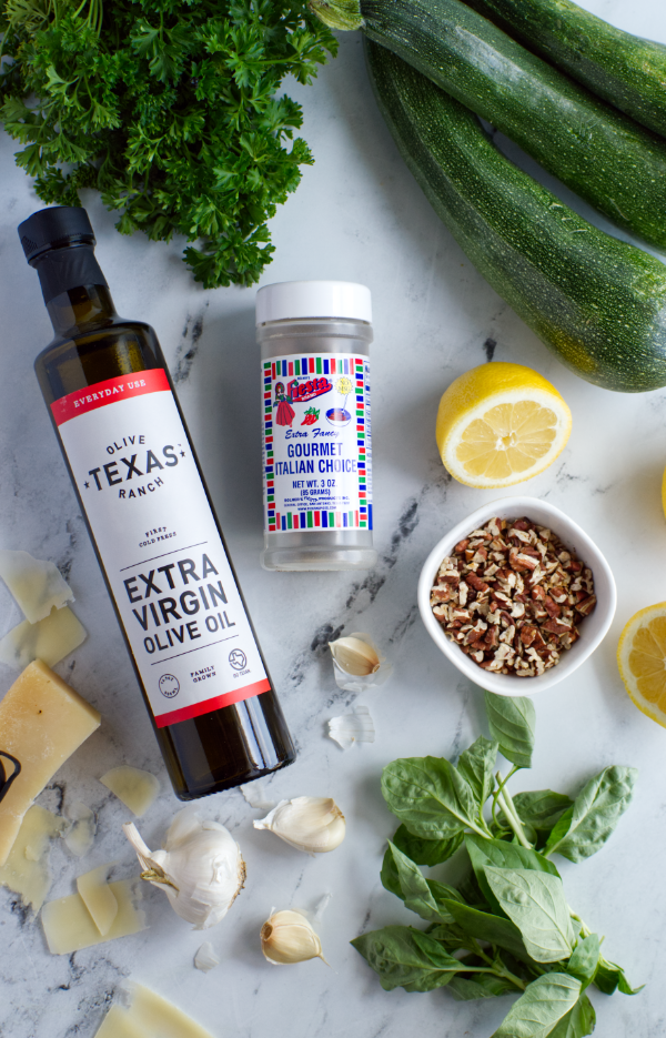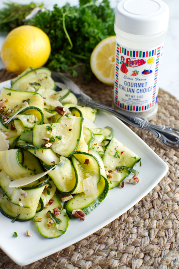 This no fuss summer salad features raw zucchini, thinly sliced and dressed with a brightlemon and olive oil dressing featuring Fiesta Brand Italian Choice Seasoning. Fresh herbs, toasted pecans and shaved Parmesan take this simple salad over the top!