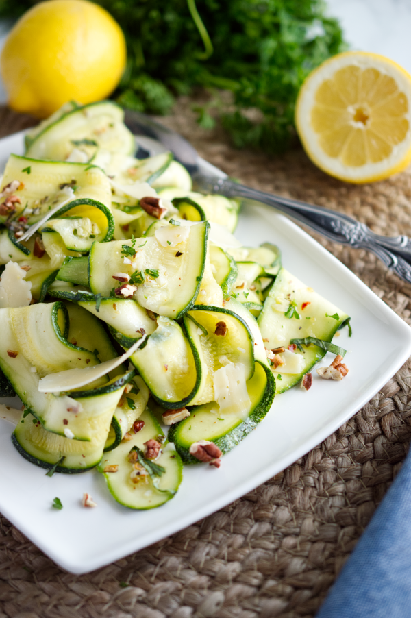 In a bowl, gently toss together the zucchini with the prepared dressing and let sit for at least 30 minutes. Before serving, toss with chopped parsley, basil, toasted pecans, parmesan and season with salt and pepper as desired and serve. Refrigerate any leftovers.